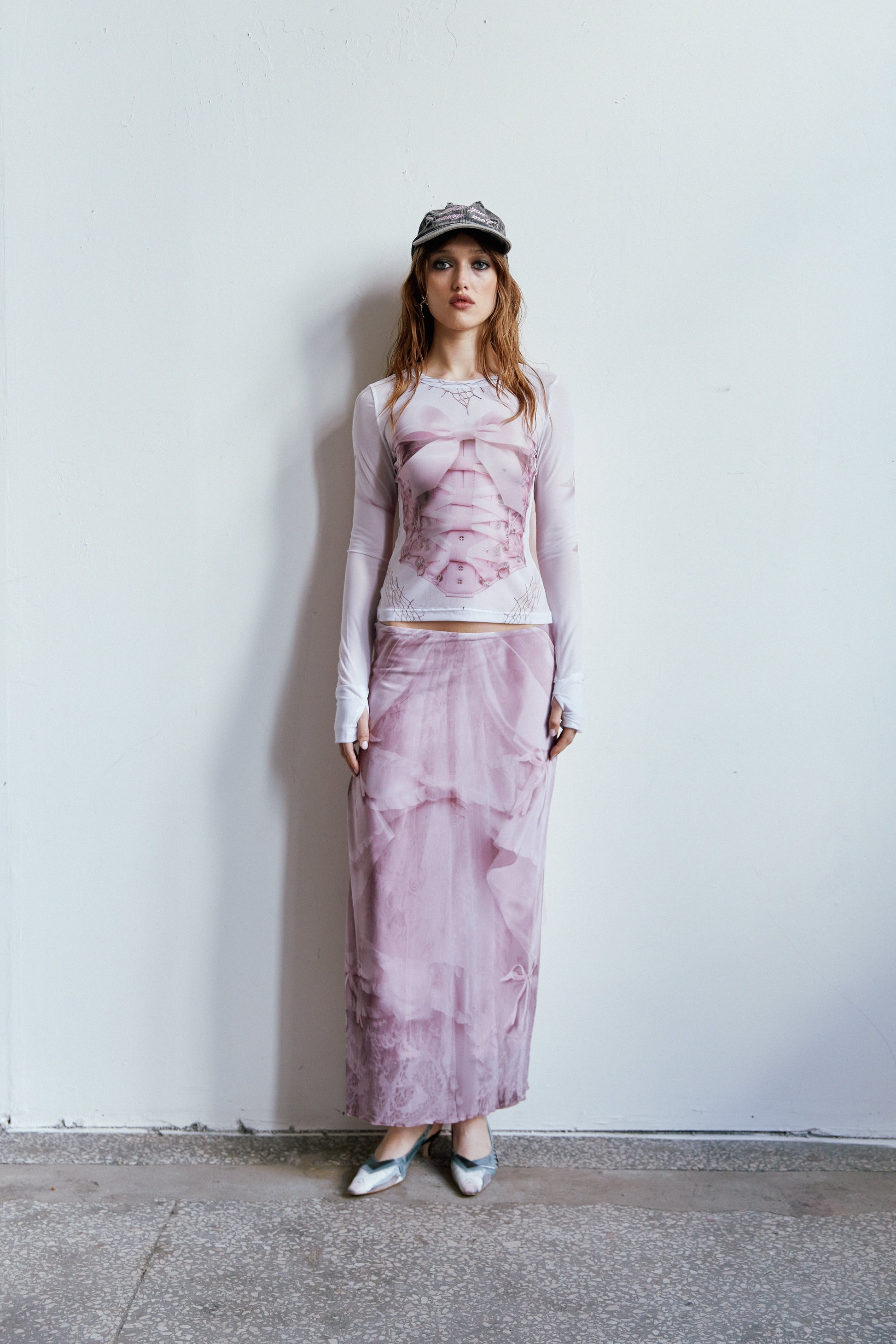 Sheer mesh design featuring a trompe-l’œil corset print cinched tight across the body, accented with playful bow details on the sleeves. Subtle spiderweb graphics frame the neckline and hip bones, adding a darkly romantic touch.